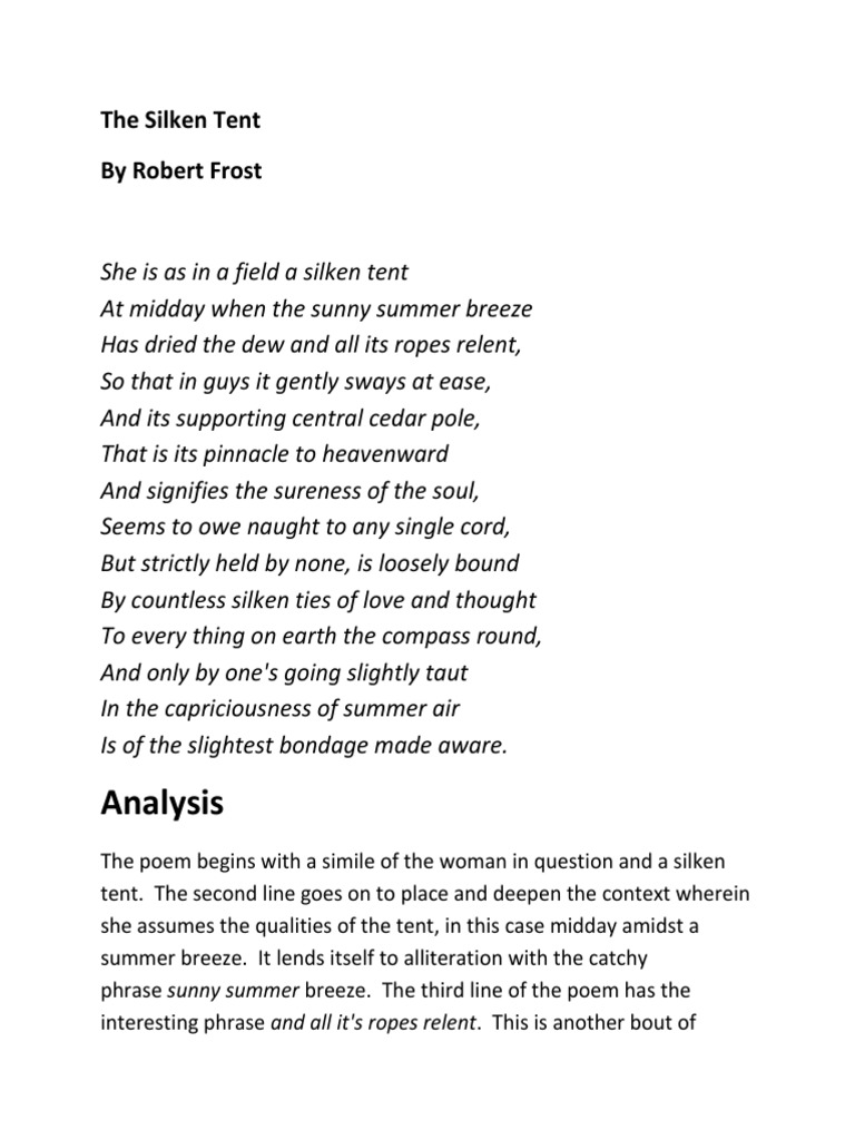 Since the immediate purpose of the piece is to promote the poets perception of love and relationship Frost prefers to deliver the. Frosts choice of rhythm form and diction beautifully link this woman to a silken tent and both to the form of the poem itself. By Jackiey Ash 0. Has dried the dew and all its ropes relent So that in guys it gently sways at ease And its supporting central cedar pole That is its pinnacle to heavenward. Robert was the eldest of their two children. The enjambed lines The silken tent helps to emphasize the importance of women.